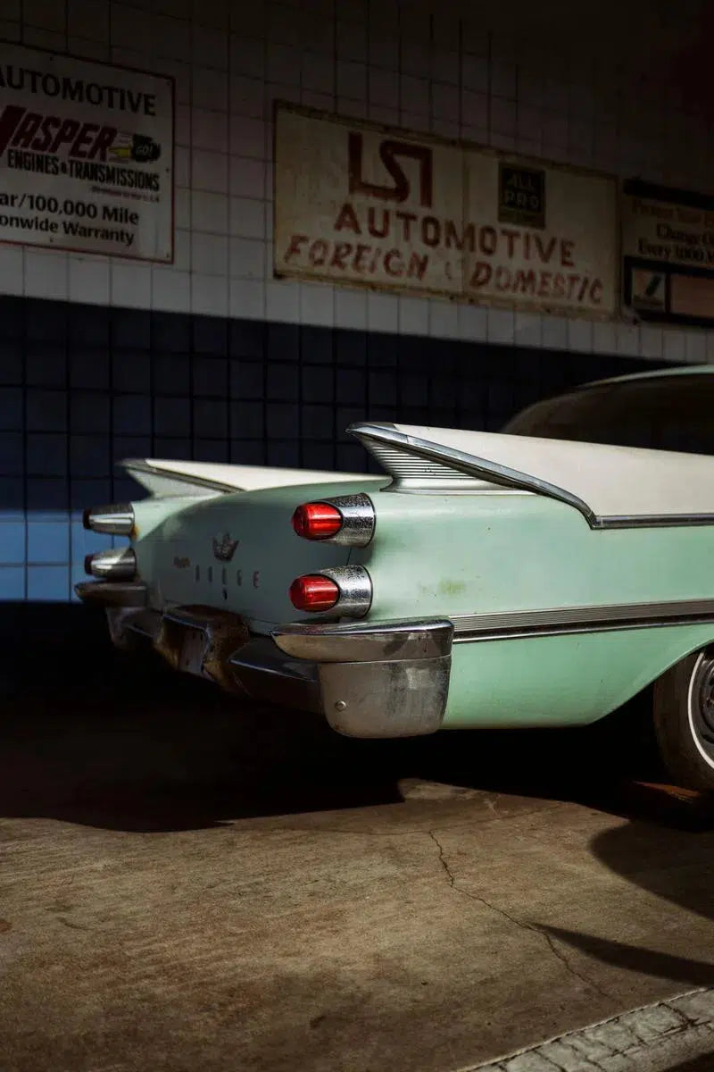 Detail of a turquoise 1957 Dodge Royal Lancer waiting for service at a mechanic's shop in San Diego