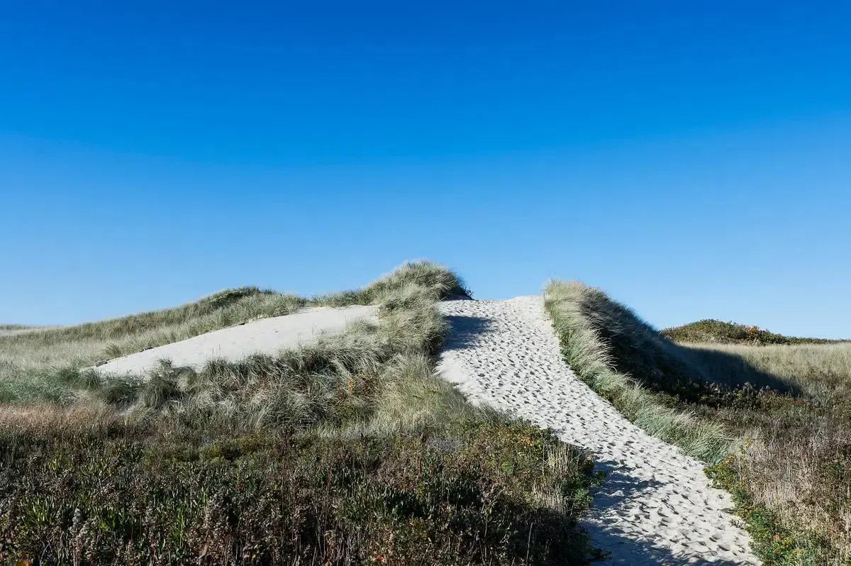 Beach path through dunes, Philbin Beach, Aquinnah, Martha's Vineyard, Massachusetts, USA.