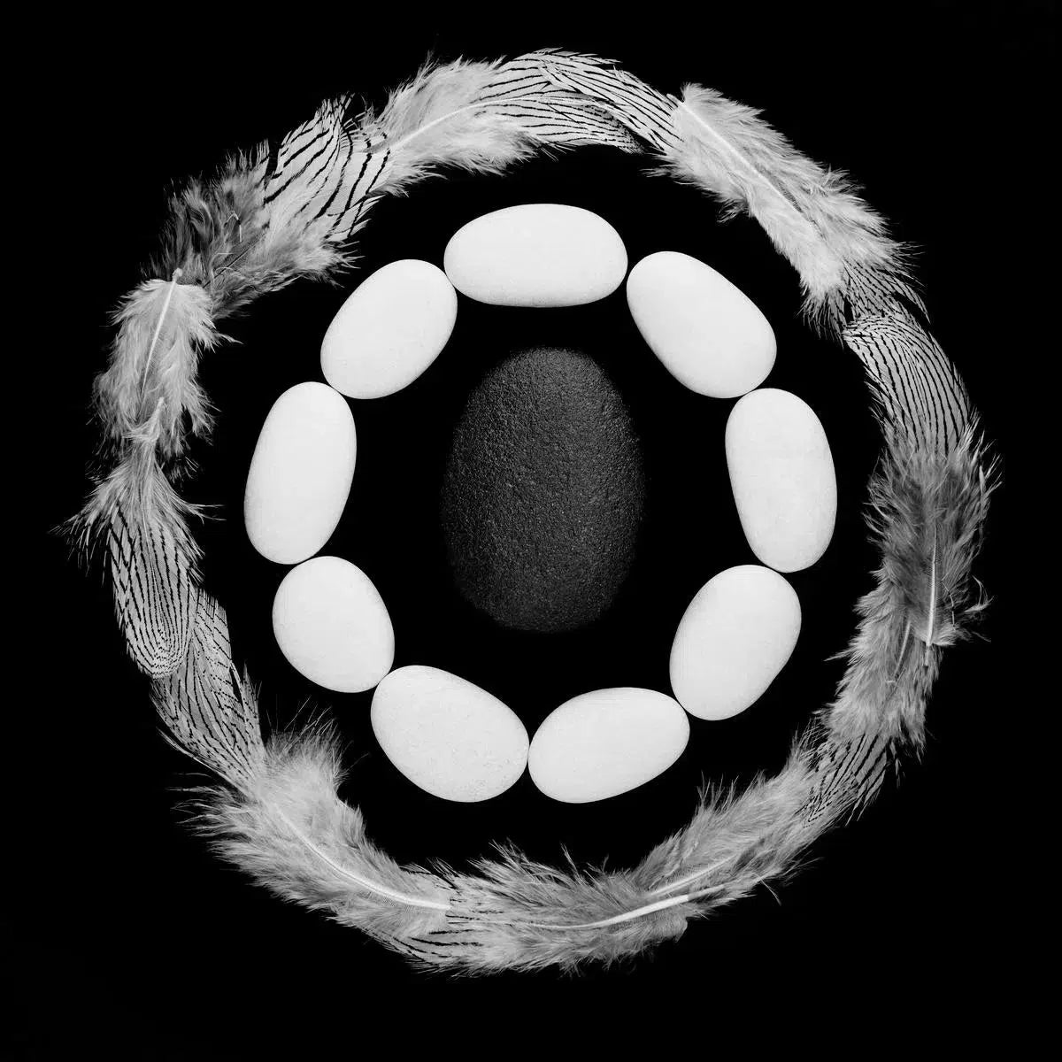 Nature still life of rocks and feathers in a circular shape on black background