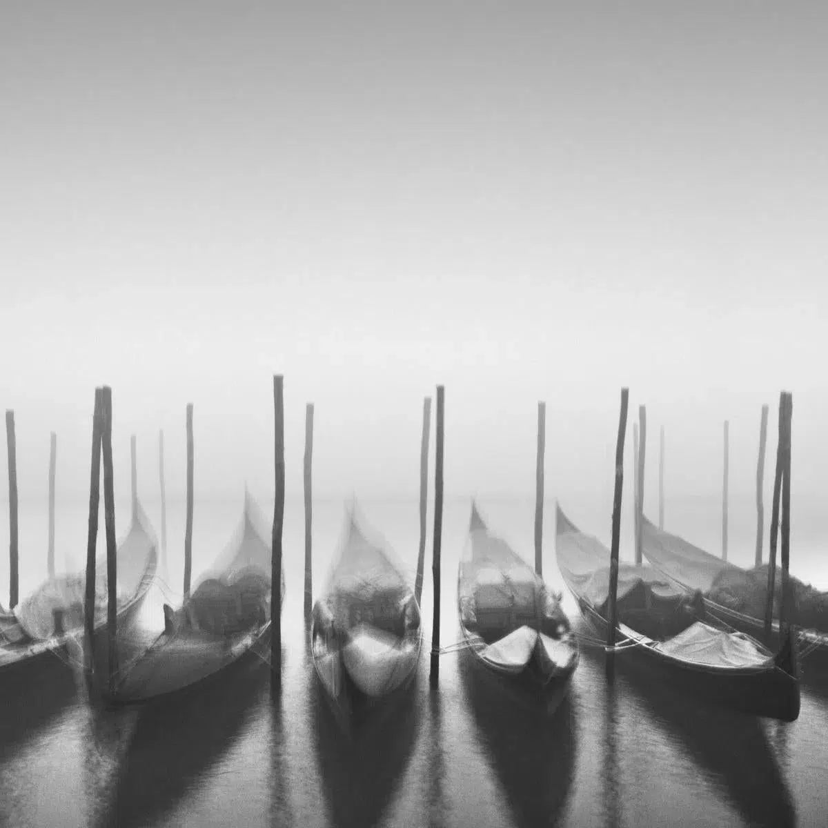 Gondolas bobbing silently in the water as the city of Venice is shrouded in a dense fog.