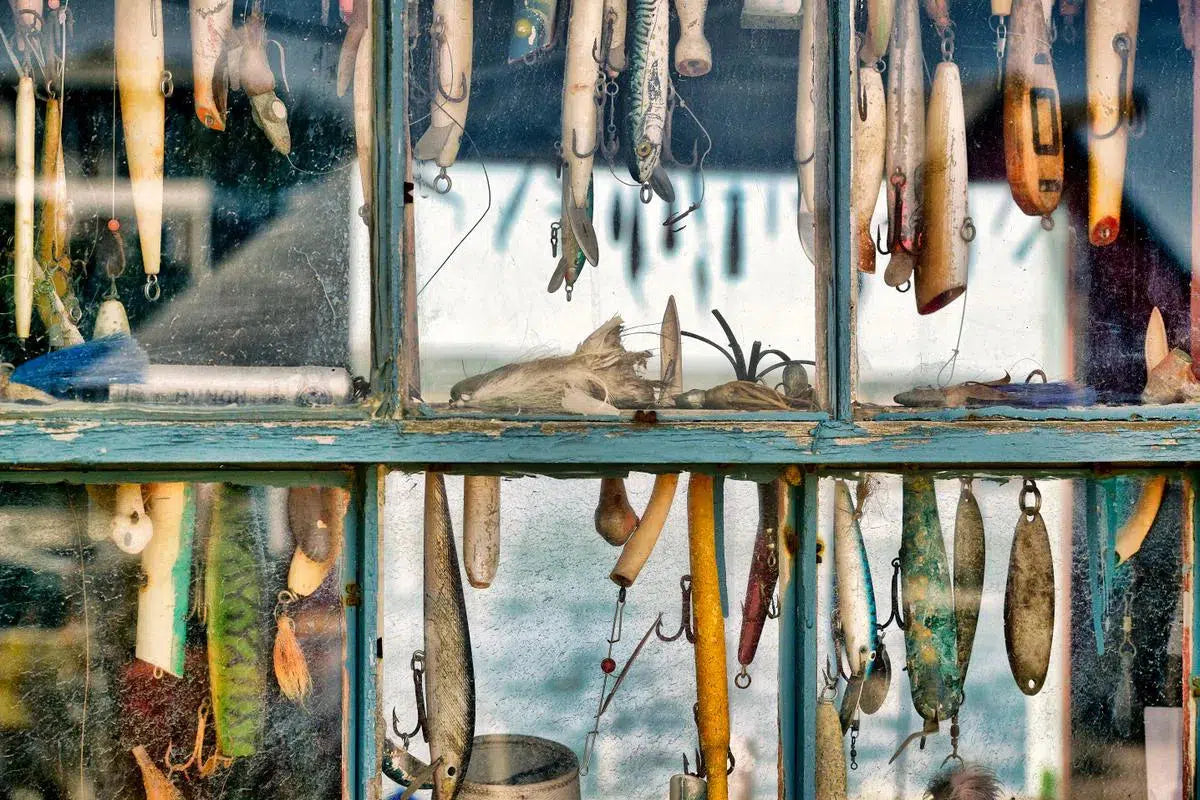 Hooks and lures in a fishing shack window, Menemsha, Chilmark, Martha's Vineyard, Massachusetts