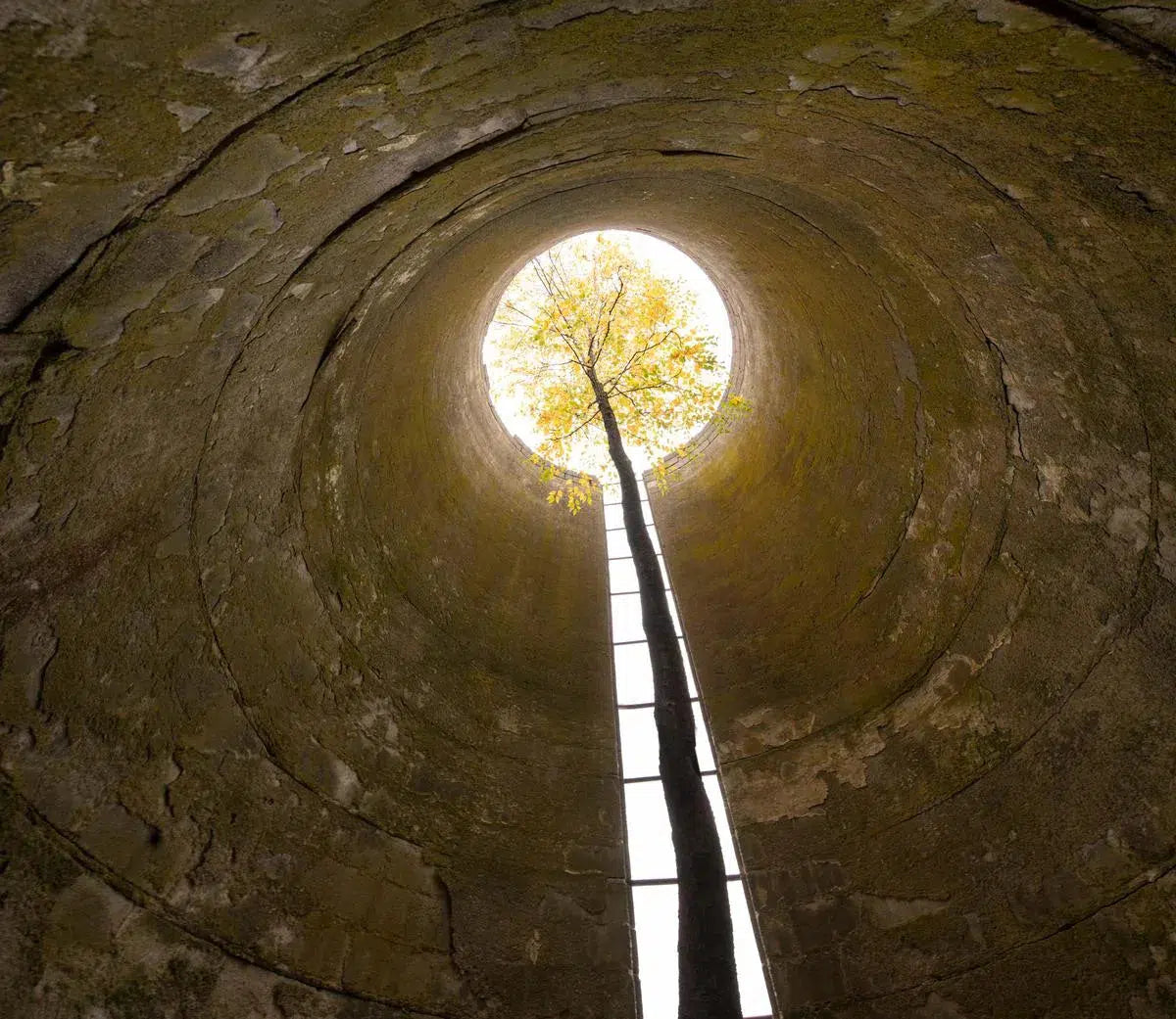 An ambitious tree grows 30' out of an abandoned silo for its leaves to reach the sun.
