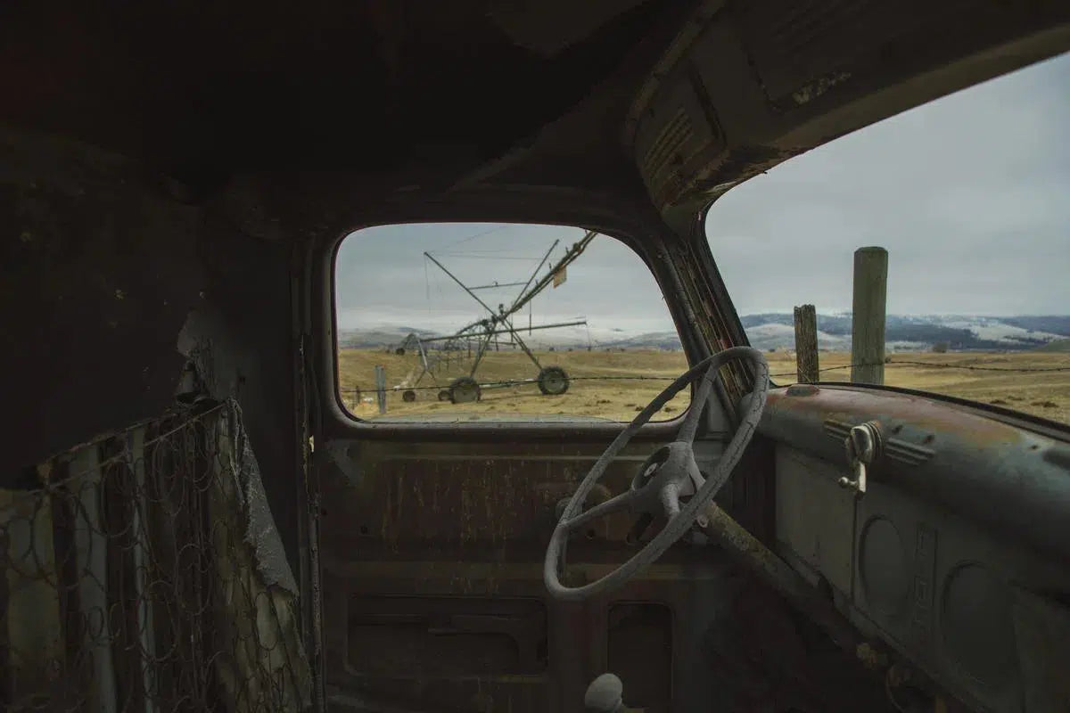 A forgotten farm truck rusts on a dirt backroad of Montana.