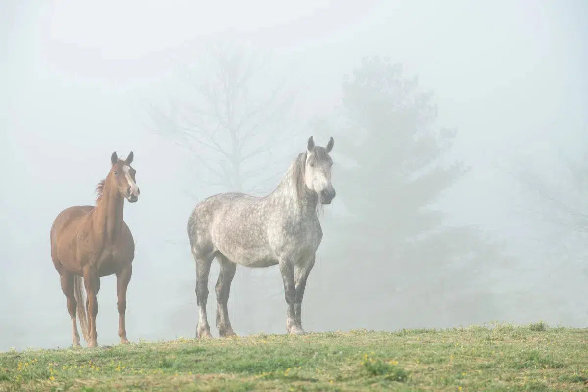 A pair of big beautiful horses stand against a peaceful misty morning.