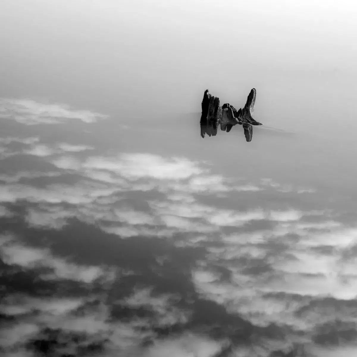 While strolling Long Beach on the west coast, I sighted a sizeable tidal pool. Half submerged in its center was a large piece of driftwood surrounded by motionless water mirroring the clouds above.