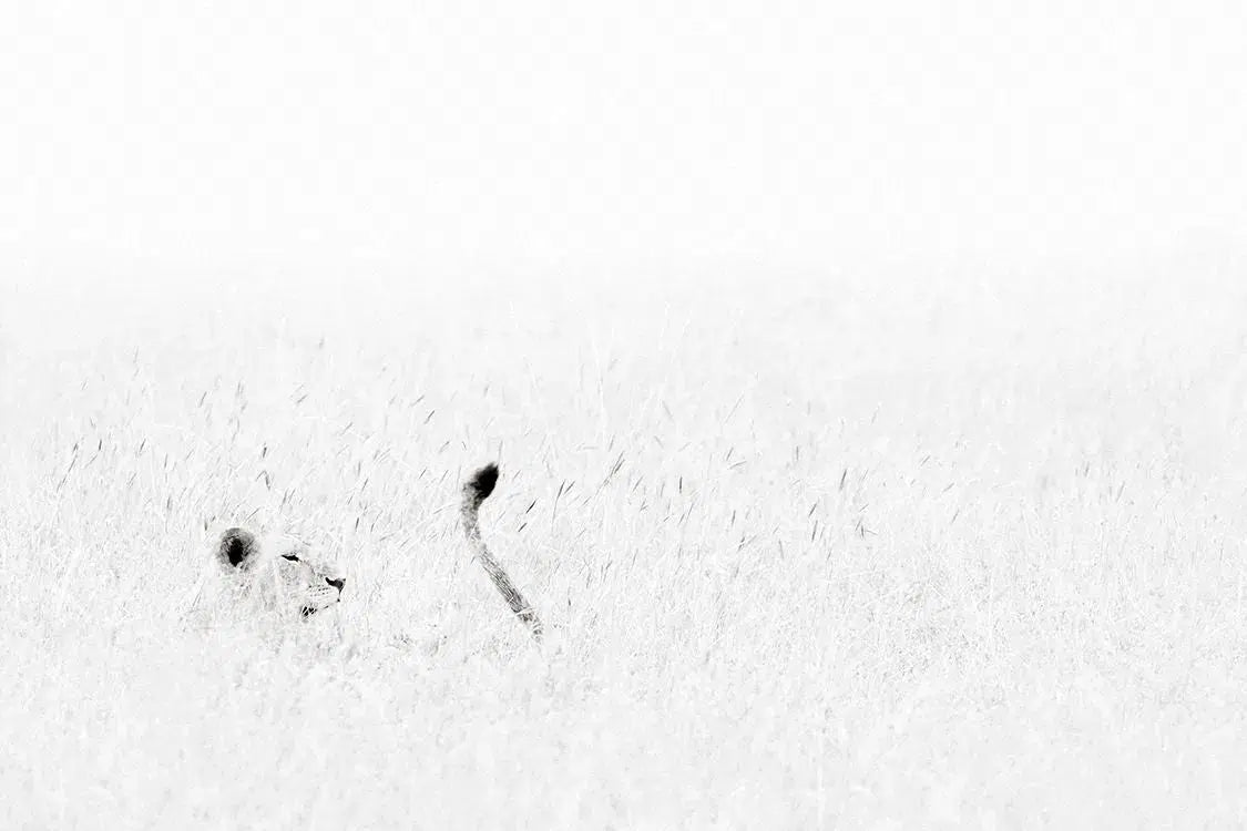 A female lion rests in the tall grass, her tail curved into a delicate, feminine shape. Not far away is her litter, but she takes this quiet moment for herself. These big cats are rulers of the Serengeti.