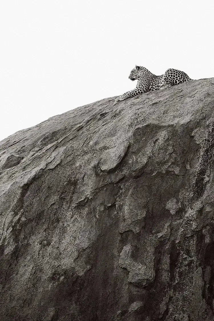 After months of no sightings, this female leopard reappeared with her cub in tow. She waits for prey on this rock, eager to provide for her young one.